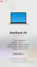 Vendo come da descrizione un Macbook Air 13 M4 con 16gb di ram e 256 di disco, perfettamente funzionante, dotato delle seguenti caratteristiche: - Display retroilluminato LED da 13,6" (diagonale) con tecnologia IPS; risoluzione nativa 2560×1664 a 224 pixel per pollice - CPU 10‑core con 4 performance core e 6 efficiency core - GPU 8-core - Ray tracing con accelerazione hardware - Neural Engine 16‑core - 16gb di ram - 256 SSD - Sensore Touch ID integrato - peso 1.24Kg E' in ottime condizioni compresa la batteria (salute 100%). Fornisco la scatola originale e accessori originali, alimentatore e cavo di alimentazione (praticamente nuovi). Sempre usato con shell protettiva. In garanzia fino ad aprile 2027. In aggiunta al materiale originale fornisco in bundle: - 1 cover shell semitrasparente sopra+sotto - 1 copritastiera in silicone Il mac è come nuovo, in perfetto stato.