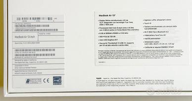 Trattato benissimo nessun graffio o difetto. Perfettamente funzionante Acquistato nel 2020 da Apple. - Caricatore • Display Retina retroilluminato LED da 13,3" (diagonale) con tecnologia True Tone; 2560 x 1600 pixel • Processore Intel Core i5 dual-core a 1,6 GHz con 4 MB di cache L3 (Turbo Boost fino a 3,6 GHz) • 8 GB di SDRAM LPDDR3 a 2133 MHz • SSD PCIe da 128 GB • Intel UHD Graphics 617 • Due porte Thunderbolt 3 (USB-C); supporto per 1/0 ad alta velocità e uscita video • Ingresso cuffie; altoparlanti stereo • Touch ID • Tastiera retroilluminata con sensore della luce ambientale • Wi-Fi 802.11ac e Bluetooth 4.2 • Videocamera FaceTime HD' • macOS preinstallato • Dimensioni e peso: 0,41-1,56 x 30,41 x 21,24 cm; 1,25 kg? • Conforme ai requisiti ENERGY STAR® Informazioni sulle condizioni della batteria: Conteggio cicli:381 Condizione:Normale