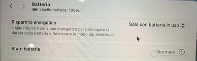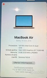 Vendo per passaggio a modello superiore questo MacBook Air 13 pollici (metà 2019) color Grigio Siderale. Il computer è stato tenuto con estrema cura, utilizzato principalmente per studio/università. È ideale per chi cerca un portatile leggerissimo, sottile e con uno schermo Retina dai colori spettacolari per guardare film o lavorare sui documenti. Specifiche Tecniche (come da foto): Display: 13,3" Retina con tecnologia True Tone. Processore: Intel Core i5 Dual-core a 1,6 GHz. RAM: 8 GB. Grafica: Intel UHD Graphics 617. Software: Già aggiornato all'ultima versione di macOS Sonoma. Sicurezza: Touch ID (sblocco con impronta digitale) perfettamente funzionante. Stato del prodotto: Estetica: Ottime condizioni, nessun segno evidente, sempre tenuto con cover protettiva e copertura per la tastiera. Batteria: Stato Normale Accessori: Incluso caricabatterie originale USB-C e scatola originale. Prezzo trattabile. Consegna a mano per permettervi di testarlo, oppure spedizione tracciata e assicurata. Disponibile per qualsiasi prova o altre foto!