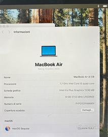 Vendo MacBook Air 13”. Ottime condizioni, usato sempre con cura in ambito universitario. Leggero scheggio nell’angolo inferiorie sx che non pregiudica in nessun modo il funzionamento. Venduto anche con carica batterie originale Apple.
