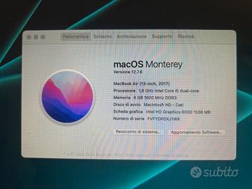Vendo MacBook Air 13 pollici, modello Early 2017, in ottime condizioni estetiche e perfettamente funzionante. Computer leggero, sottile e affidabile, ideale per studio, lavoro e utilizzo quotidiano.