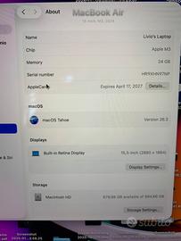 MacBook Air 15" M3 24GB 1TB con AppleCare +
