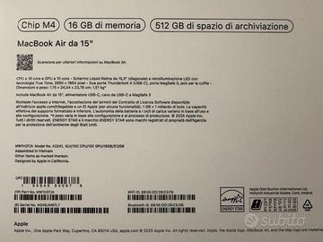 Vendo per regalo non utilizzato, MacBook Air (NUOVO) da 15 pollici con chip M4, CPU a 10 core e GPU a 10 core, Memoria unificata da 16 GB e SSD da 512GB di spazio archiviazione, Schermo Liquid Retina da 15,3’’. Nuovo, ancora imballato, attivato da azienda con garanzia ufficiale fino al 7/01/27 come da foto.