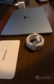 Apple Portatile MacBook Air 15'' con chip M4 (2025): progettato per Apple Intelligence, display Liquid Retina da 15,3'', 16GB di memoria unificata, 256GB di archiviazione SSD, CPU 10 CORE, GPU 10 CORE, presa a muro con 2 uscite usb, Touch ID; Celeste. Condizione nuovo, con 3 cicli carica batteria (aggiornato ad oggi 14 aprile 2026). Consegno la ricevuta di pagamento di Amazon Italia. Prezzo richiesto euro 1.000 NON TRATTABILE. Consegna a mano. non spedisco e non scambio.