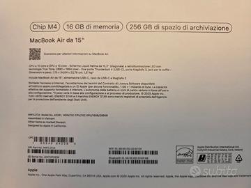NUOVO MAI APERTO. Computer portatile apple MacBook Air 15'' M4 16GB Ram 256 GB. Cpu a 10 core e GPU a 10 core. schermo liquid retina da 15.3 pollici e retroilluminazione led.