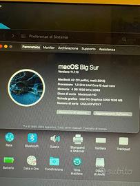 MacBook air 2013 processore intel i5 dualcore 1.3 ghz. ram 4 GB, 1600mhz DDR3, Scheda grafica intel HD Grafic 5000 15 36, Display 1440X900 , HD 128 GB , Batteria in ottime condizioni.