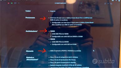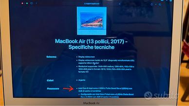 Vendo Apple MacBook Air 13" acquistato nuovo nel 2018. Come visibile dalle foto l'articolo è in condizioni eccellenti, zero graffi, giusto qualche minuscolo e impercettibile segno di usura sulla guscio inferiore del computer. Modello equipaggiato con processore Intel i5 da 1.8ghz, 8gb di RAM e 128gb di memoria disponibile. Il sistema operativo installato è l'ultimo disponibile per questo modello (Monterey 12.7.4). Batteria in ottime condizioni, regge tranquillamente ancora 8 ore di lavoro, è stato mantenuto in maniera maniacale. Il computer viene venduto completo di scatola e tutti gli accessori, compreso il caricatore originale con prolunga. Ulteriori foto in chat. Vendo per passaggio a nuovo modello.