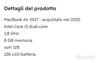 Vendo MacBook Air del 2017, acquistato nel 2020. Intel Core i5 dual core 1,8 GHz Ram 8gb 128gb ssd 150 cicli ricarica In ottime condizioni estetiche. Incluso scocca cover superiore e inferiore - Perfetto per studenti e professionisti Trattabile