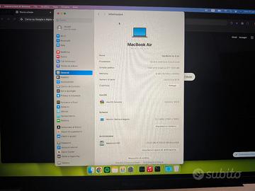 Vendo il mio McBook Air 13-inch con scatola e caricatore originali in buonissime condizioni ci sono solo due piccole ammaccature sul retro: CPU: Intel Core i5 dual-core a 1,6 GHz con 4 MB di cache L3 ( Turbo Boost fino a 3,6Ghz) Ram: 8Gb di SDRAM LPDDR3 a 2133MHz SSD: PCle da 617 Scheda Grafica: Intel UHD Graphics617 FUNZIONALITÀ AGGIUNTIVE: Touch ID Due porte Thunderbolt 3 ( USB-C) Tastiera Retroilluminata con sensore luce ambiente Ecc...