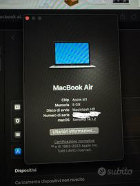 Vendo Macbook Air del 2020. Leggero, compatto e veloce. Processore M1 8gb Ram 500gb di Hard Disk Custodia imbottita Scatola e caricabatteria originale Batteria con 243 cicli