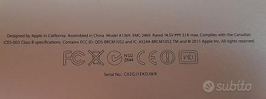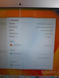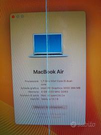 macbook air funzionante ma con riga di pixel sullo schermo (vedere foto) , raramente la linea diventa più larga e bisogna aprire e chiudere lo schermo per farla tornare sottile, la cornice dello schermo é attaccata con il nastro adesivo. Caratteristiche come da foto,.La fotocamera non funziona e la batteria dura dai 30 minuti a 1 ora e 30 a seconda dell uso. installato mac os Ventura tramite patch opencore. il caricatore funziona male ma se volete posso spedirlo insieme al mac.