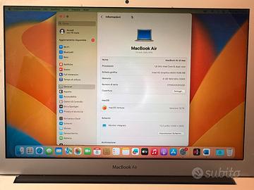 Vendo MacBook air A1466, in ottime condizioni,usato pochissimo,batteria sostituita circa 10 mesi fa e fatta pulizia hardware .Installato mac os Ventura e vari programmi.Memoria interna 128 Gb,ma compreso nel prezzo do un adattatore per le solite ssd nvm .