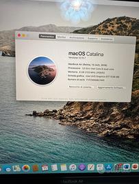Versione 10.15.7 MacBook Air (Retina, 13-inch, 2019) Processore 1,6 GHz Intel Core 15 dual-core Memoria 8 GB 2133 MHz LPDDR3 Scheda grafica Intel UHD Graphics 617 1536 MB Numero di serie FVFZM4M8LYWG É un computer conservato benissimo, non ha difetti, non ha nulla