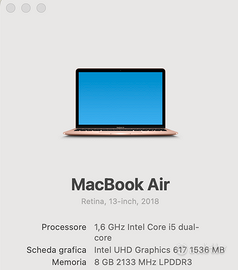 Vendo MacBook Air Gold 13,3” Retina del 2018, in ottime condizioni e perfettamente funzionante. Specifiche: Processore Intel Core i5 dual-core 1,6 GHz RAM 8 GB SSD 256 GB Display Retina 13,3” Risoluzione 2560 × 1600 Scheda grafica Intel UHD Graphics 617 macOS Sonoma 14.8.2 Tenuto molto bene. Batteria sostituita recentemente presso un rivenditore autorizzato Apple. Ideale per: studio smart working navigazione web pacchetto Office email videochiamate Computer leggero, affidabile e comodo da trasportare. Disponibile per visione e prova. Preferita consegna a mano, eventuale spedizione da concordare.