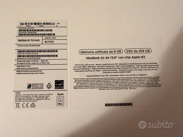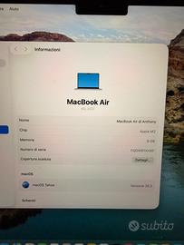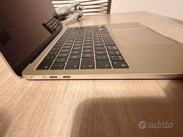 Vendo splendido MacBook Air 13 pollici con chip Apple M2, nell'elegantissima colorazione Galassia (Starlight). Il computer è in condizioni pari al nuovo, senza alcun segno di usura, graffio o ammaccatura. È stato utilizzato pochissimo, esclusivamente per navigazione web saltuaria e gestione della posta elettronica, quindi la batteria è ancora al massimo della sua efficienza (pochi cicli di ricarica). Caratteristiche principali: Processore: Chip Apple M2 (CPU 8-core / GPU 8-core) Display: Liquid Retina da 13.6" con tecnologia True Tone Colore: Galassia (un dorato champagne molto raffinato) Design: Ultra sottile, leggero e senza ventole (completamente silenzioso) Porte: MagSafe 3 per la ricarica, 2 porte Thunderbolt / USB 4, jack cuffie Cosa include l'offerta: MacBook Air 13" M2 Alimentatore originale Apple Cavo MagSafe in tinta (intrecciato) Scatola originale e imballaggi integri Note: Il computer è stato formattato e rimosso da iCloud, pronto per essere configurato dal nuovo proprietario.