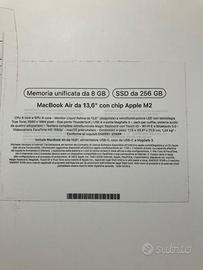 MacBook Air da 13,6" SSD da 256 GB - CPU 8 core e GPU 8 core - Monitor Liquid Retina da 13.6"a retroilluminazione led - due porte Thunderbolt /USB 4 e porta MagSafe 3 + Jack per cuffie - Tastiera retroilluminata