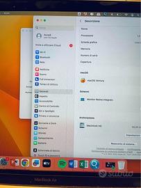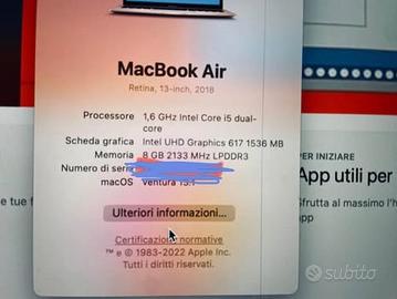 Vendo MacBook Air del 2018 Colore GOLD SSD 256 GIGA 8Gb Ram Prima della fine della garanzia ho fatto sostituire il case inferiore e la tastiera (sono quasi nuovi) Il monitor presenta una singola linea verticale di black pixel che potete vedere dalle immagini presenti. Il MacBook è sempre e solo stato tenuto in una custodia/ case protettiva, pertanto non presenta nessun tipo di graffio, ammaccatura, o quant'altro all'esterno. Durata della batteria circa sei/otto ore (naturalmente dipende anche dall'uso di quali programmi utilizzate) Preferisco scambio a mano su Foggia o provincia, spedisco a carico dell'acquirente.