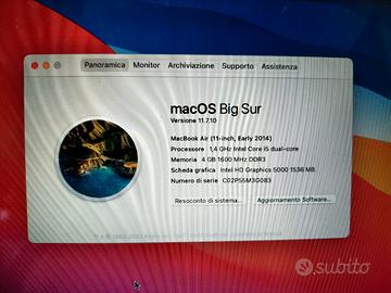 Macbook Air 2014, piccolo leggero, nessun problema Hardware, pochissimi segni di usura, completo di caricabatterie, ultimo aggiornamento a Big Sur, 4GB di ram, Intel core I5, regalo anche adattatore usb tipo C