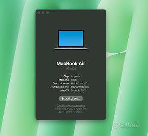 Vendo MacBook Air M1 13” (2020) in ottime condizioni, con schermo nuovo sostituito da Apple a gennaio 2025 (in garanzia con AppleCare+). Un computer potente, leggero e silenzioso, ideale per lavoro, studio o uso creativo.
