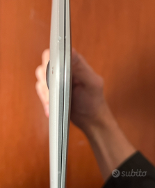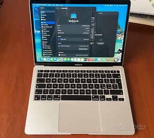 Vendo Apple MacBook Air (M1, 2020) in buone condizioni generali e perfettamente funzionante. * Chip Apple M1 * 8 GB RAM * 256 GB SSD Il computer funziona perfettamente in ogni sua parte, veloce e adatto a studio, lavoro e uso quotidiano. Presenta alcuni segni estetici dovuti all’utilizzo: * piccole bottarelle sulla scocca * cornice del display in alcuni punti non perfetta Difetti solo estetici, non influiscono sull’utilizzo. Nota sulla batteria: autonomia ridotta, consigliata sostituzione nel breve-medio periodo (batteria al 72% che ha da poco superato 1000 cicli)