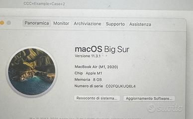 Caratteristiche Tecniche •Modello: MacBook Air (M1, 2020) •Processore: Chip Apple M1 •RAM: 8 GB •Archiviazione: 512 •Sistema Operativo: macOS Big Sur, versione 11.3.1 •Numero di serie: C02FQUKUQ6L4 (utile per verificare garanzia o supporto Apple) ⸻ 🖥️ Display •Tipo Schermo: Retina integrato •Dimensione: 13,3 pollici •Risoluzione: 2560 × 1600 ⸻ 🔋 Stato della Batteria •Condizione: Normale •Capacità Massima: 84% Nota: una capacità dell’84% indica un’usura fisiologica moderata, ancora in buone condizioni d’uso. ⸻