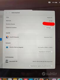MacBook Air M1 RAM 16GB Disco 512GB Batteria 12 cicli e capacità 100% In condizioni eccellenti. Sempre tenuto con cover trasparente sottile (che includo nella vendita). Tastiera italiana. Colore grigio siderale. Caricabatterie e scatola originali.