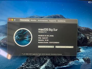 MacBook Air (M1,2020) Chip: Apple M1 Memoria 16GB stato batteria : 94% condizione estetiche perfette fornito di scatola