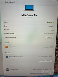 Vendo causa inutilizzo portatile Apple Macbook Air M1 8GB ram 256GB di memoria. Condizioni: COME NUOVO Caricabatteria originale incluso nella confezione Cover azzurra in omaggio.