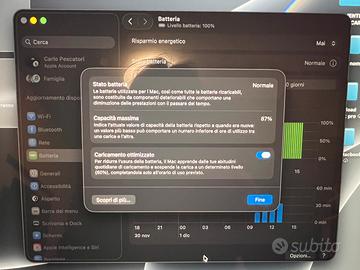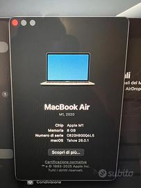 Per necessità di passaggio ad altro modello più performante, vendo MacBook Air M1 del 11/2021 (possiedo regolare prova di acquisto). Il Macbook si presenta in ottime condizioni, essendo sempre stato utilizzato con cover rigida esterna e custodia imbottita durante i trasporti. Includo, con la scatola di acquisto, anche l'alimentatore ed il cavo originale. Il computer viene venduto formattato alle impostazioni di fabbrica, pronto per una nuova configurazione. Ottima macchina per studenti delle scuole medie/superiori o università umanistiche. Di seguito le specifiche: - Colore: grigio siderale - Chip: Apple M1 - CPU: 8-core - GPU: 8-core - Neural Engine: 16-core - RAM: 8GB di memoria unificata - Disco fisso: SSD da 512GB - Stato della batteria: 87% - Sistema operativo: macOS Tahoe 26.0.1 - Dimensioni schermo: 13" Preferisco scambio a mano (anche per verifica di quanto descritto) su Venezia, Centro Storico, Lido, Piazzale Roma, Mestre e Marghera. Possibile spedizione a carico dell'acquirente con modalità di pagamento da concordare. Prezzo leggermente trattabile.