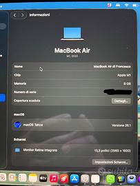 Vendo MacBook Air M1 ottobre 2021, configurazione 8GB di RAM e 256GB SSD completo di scatola e accessori. Il computer è in ottime condizioni, sempre tenuto con cura e utilizzato in modo leggero. La batteria è in ottimo stato.