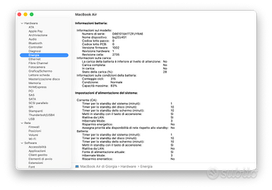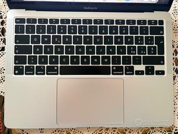 Vendo MacBook Air con chip Apple M1, perfettamente funzionante e in ottime condizioni estetiche. Specifiche: CPU 8-core / GPU 8-core RAM 8GB SSD 512GB Batteria all’83% (vedasi foto) Il computer è sempre stato usato con cura, nessun difetto se non un microscopico segnetto angolo dx, mai riparato. Inclusi: Caricatore originale Apple Scatola originale Ideale per studio, lavoro e uso quotidiano.