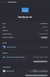 🖥️ MacBook Air 13” 2022 M2 – 8GB RAM – 512GB SSD – Batteria Ottima Vendo MacBook Air M2 (2022) 13 pollici, potente e super leggero, perfetto per studio, lavoro e uso quotidiano. 💻 Specifiche: Chip Apple M2 Display 13,6" Retina RAM 8GB SSD 512GB (molto più spazio rispetto al base) 🔋 Batteria: Solo 46 cicli 94% capacità → autonomia ancora eccellente ✨ Condizioni: Ricondizionato e perfettamente funzionante Ottime condizioni generali Nessun problema tecnico 📦 Incluso: Caricatore 🚀 Punti forti: Veloce e silenzioso (senza ventole) Leggero e comodissimo da portare Ideale per università e lavoro 💰 Prezzo: 699€ leggermente trattabili 📍 Consegna a mano / spedizione disponibile 📸 Posso inviare altre foto e video su richiesta.