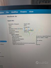 Propongo MacBook Air M2 16gb/512gb 100% 3 cicli ,risale a febbraio 2024 , garanzia scaduta questo febbraio 2026, mai utilizzato esattamente poco, km 0. Carica batteria π originale doppia uscita USB c e MagSafe. Versione CPU 8core e 10 GPU consegna a mano preferibile a Binasco con prova dell Mac che Γ© davvero perfetto senza nessun graffio stato AAA pari al nuovo No scatolo Prezzo Top