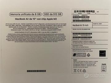 Vendo MacBook air M2 15” 8Gb di RAM e 512GB di HD, condizione come nuovo nessun graffio o ammaccatura, acquistato da MediaWorld il 09/01/2024 , tutto documentato da scontrino , lo stato della batteria ad oggi 05/02/26 e del 95% con appena 68 cicli di ricarica, il computer è dotato di scatola originale alimentatore con doppia presa USB C e cavo, inoltre è inclusa la sua cover come in foto