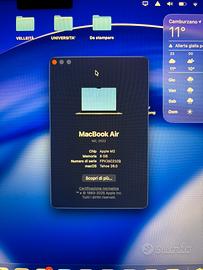 Vendo MacBook Air M2 [2022] per inutilizzo. Caratteristiche principali: •Processore: Apple M2 •Colore: Mezzanotte •RAM: 8 GB •Archiviazione: 256 GB SSD •Schermo: 13,6 pollici Retina •Sistema operativo aggiornato all’ultima versione macOS Tahoe •Batteria con capacità massima al 97% •Condizioni estetiche pari al nuovo, nessun segno di usura Completo di scatola e caricatore originale. Prezzo: €750 (trattabile se realmente interessati) Consegna preferibilmente a mano in zona Biella e zone limitrofe. Contattami per foto dettagliate o ulteriori informazioni. Ottima occasione, pronto all’uso!