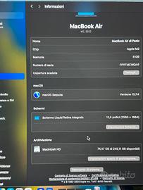 Vendo MacBook Air M2 per scarso utilizzo. Come nuovo, completo di accessori e scatola. Tastiera usata sempre con pellicola protettiva.