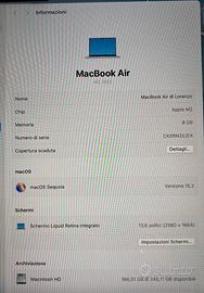 Vendo MacBook Air M2. Ram 8gb Ssd 256gb. Acquistato a dicembre 2024, viene venduto per inutilizzo con scatola e caricatore originali. È sempre stato utilizzato con cover e pellicola per tastiera, compresi nella vendita. Condizioni come nuovo, stato batteria 100%.