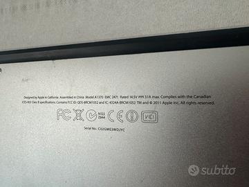 Macbook Air meta 2011 solo per partidi ricambio, recuparabili lo schermo, tastiera, scocca posteriore, memoria, ram e tanto altro, batteria non disponibile in quanto non funzionate, completo di cavo di alimentazione. Telaio in due angoli storti causa caduta. SOLO PER PARTI DI RICAMBIO. Non si accettano resi.