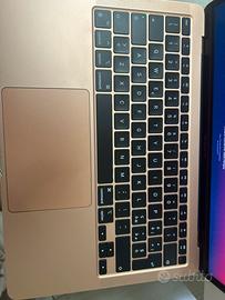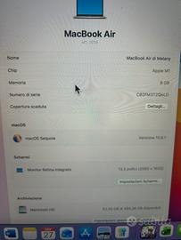 MacBook Air in ottime condizioni, numero di serie: C02FM3T2Q6LD stato della batteria 90% venduto insieme a scatola e caricatore originale processore Apple M1 capacità di archiviazione 512GB sistema operativo macOS