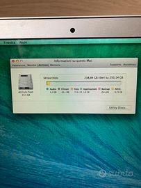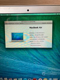 Vendo Macbook air 13” anno 2013. Modello A1466. Macbook perfettamete funzionate, con possibilità di aggiornarlo a versione piu recente (mac os big sur). Non presenta nessun segno evidente dovuto all’usura se non un piccola botta in alto a destra (vedi ultima foto). Batteria 658, dura ancora per avere tutti questi anni. Alimentatore originale 45w (un po’ conciato ma funzionante). Caratteristiche: -processore I5 1,4ghz -RAM 4gb -SSD 251gb -sistema operativo MacOs x 2016.