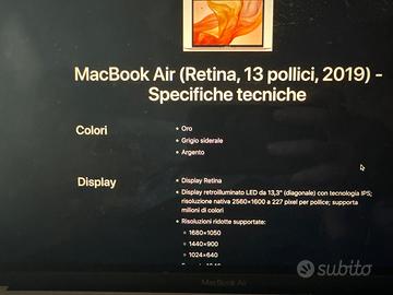 vendono macbook air (Retina, 13pollici,2019) Grigio siderale . Intel Core i5 dual-core a 1,6Ghz (Turbo Boost fino a 3,6GHz) con 4 MB di cach L3 Unita SSD PCle da 128GB configurabile con unita SSD da 256/512 o 1T Memoria 8GB LPDDR3 a 2133MHz su scheda.