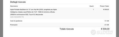 Vendo con grande dispiacere un bellissimo macbook air 13 2025 che mi è stato regalato , pagato 940€ .