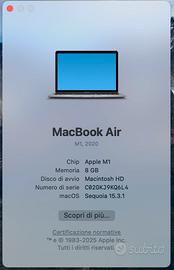 Vendo Macbook Air M1, 256gb. Unico proprietario, sempre usato in casa come computer secondario. Condizioni pari al nuovo, batteria al 95%