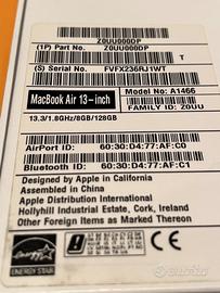 Vendo Notebook Apple MacBook Air 13” finitura silver, versione anno 2017, Processore Intel Core 1.8 GHz i5 dual-core (Turbo Boost sino a 2.9 GHz) con 3MB di cache L3 condivisa, Archiviazione 128GB Unità SSD PCle, Memoria 8 GB 1600 MHz DDR3, Scheda grafica Intel HD Graphics 6000, 1536 MB. Numero di serie FVFX236RJ1WT. Peso1.35kg. Imballaggio originale contenente tutti i cavi, in perfette condizioni. Inizializzato, sistema operativo Monterey versione 12.7.6.