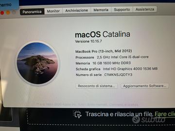 Vendo per inutilizzo MacBook pro 13 inch mid 2012 processore 2,5 GHz intel Core i5 dual-core menoria 16 GB 1600 MHz DDR3