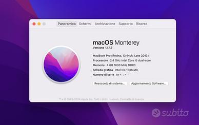 Vendo Macbook late 2013 con problema al display (dopo un po' compaiono delle righe), ma collegandolo ad un monitor esterno non dà alcun problema. Per il resto è perfetto, ma lo vendo come "pezzi di ricambio". Attualmente c'è installato Monterey attraverso OCLP. Eventuale spedizione a carico dell'acquirente