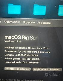 MacBook Pro (Retina, 13-inch, Late 2013) Processore 2,4 GHz Intel Core i5 dual-core Memoria 4 GB 1600 MHz DDR3 Scheda grafica Intel Iris 1536 MB
