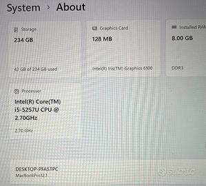 MacBook Pro 12,1 – 13.3” Retina in ottime condizioni Vendo MacBook Pro perfettamente funzionante e ben tenuto, ideale per lavoro, studio o uso quotidiano. 🔹 Display Retina da 13.3” luminoso e nitido 🔹 Processore Intel i5 🔹 8 GB di RAM 🔹 SSD da 256 GB veloce 🔹 Installati macOS Sequoia 15.7.5 e Windows 11 🔋 Batteria in ottimo stato con meno di 500 cicli Computer pronto all’uso, veloce e affidabile. Contattami per maggiori informazioni.