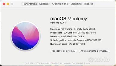 MacBook Pro 13” 2015 perfettamente funzionante, imperfezioni dello schermo che non compromettono la qualità dell’immagine.
