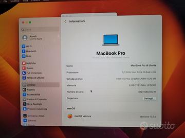 MacBook Pro 13 pollici ( 2017 , 2 porte Thunderbolt 3) A1708 Processore intel core i5 Upgrade con SSD da 512 GB Western Digital (in origine aveva il 128GB) RAM 8 GB Schermo Retina Alimentatore Originale incluso Pacchetto Office 2021 installato Numero seriale in foto In omaggio custodia di colore nero Venduto con formula visto e piaciuto Si preferisce scambio a mano così da provare l'efficienza del MacBook ma nel caso si può anche spedire. MacBook Pro no touch bar no 2015 no 2016 no m1 m2 m3 m4 Retina 13 15 500GB